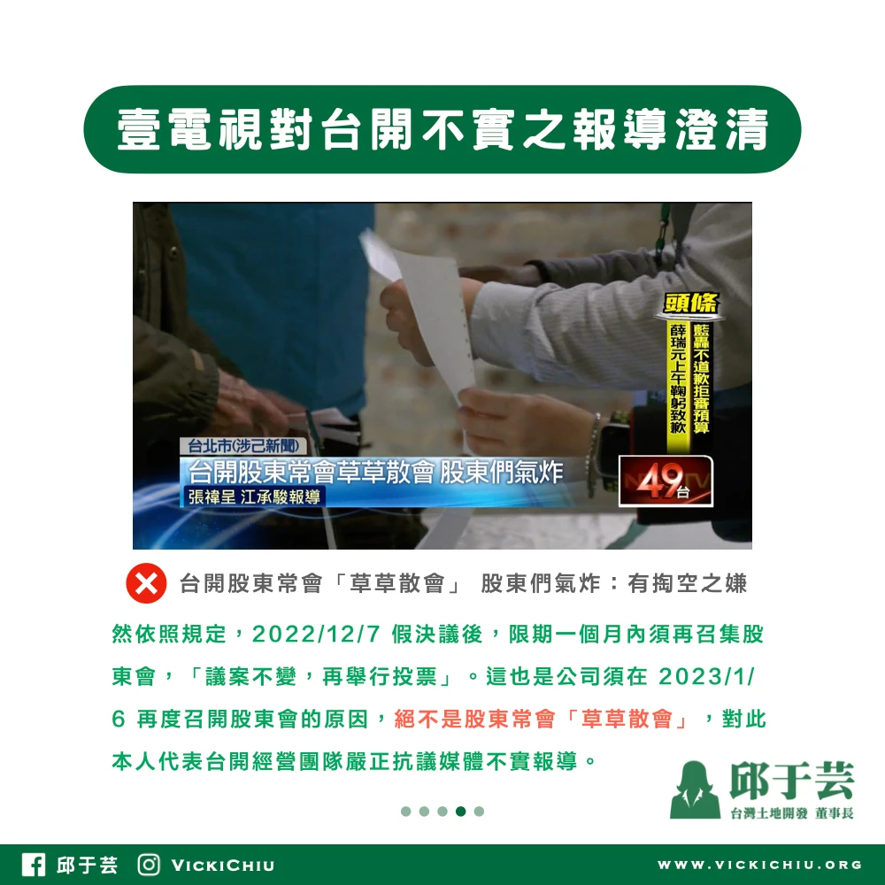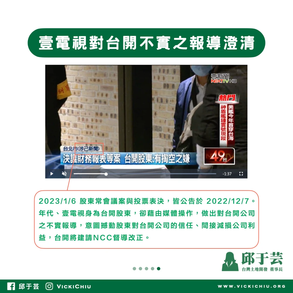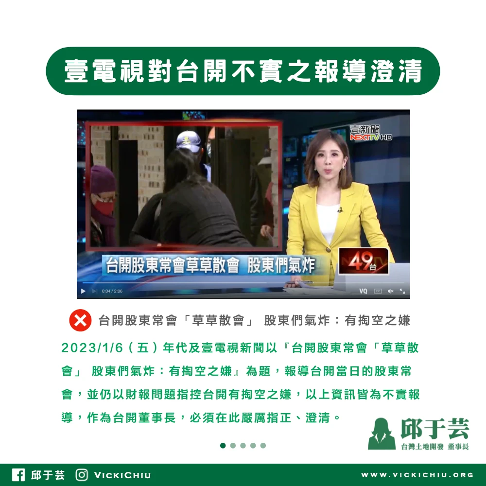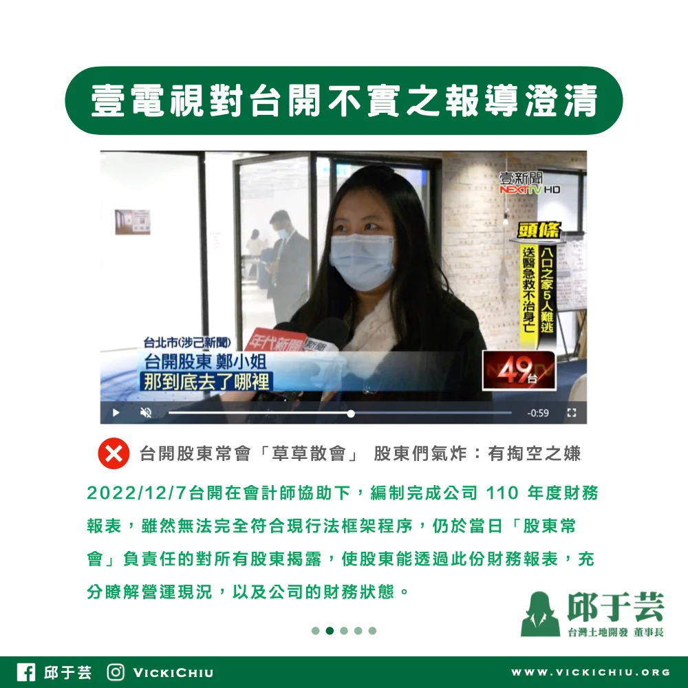 年代新聞、壹電視 身為台開股東,卻藉由媒體操作,做出對台開公司之不實報導,意圖撼動股東對台開公司的信任、間接減損公司利益,台開將建請NCC督導改正。 2023/1/6(五)年代及壹電視新聞以『台開股東常會「草草散會」 股東們氣炸:有掏空之嫌』為題,報導台開當日的股東常會,並仍以財報問題指控台開有掏空之嫌,以上資訊皆為不實報導,作為台開董事長,必須在此嚴厲指正、澄清。 2022/12/7 台開在會計師協助下,編制完成公司 110 年度財務報表,雖然無法完全符合現行法框架程序,仍於當日「股東常會」負責任的對所有股東揭露,使股東能透過此份財務報表,充分瞭解營運現況,以及公司的財務狀態。 …